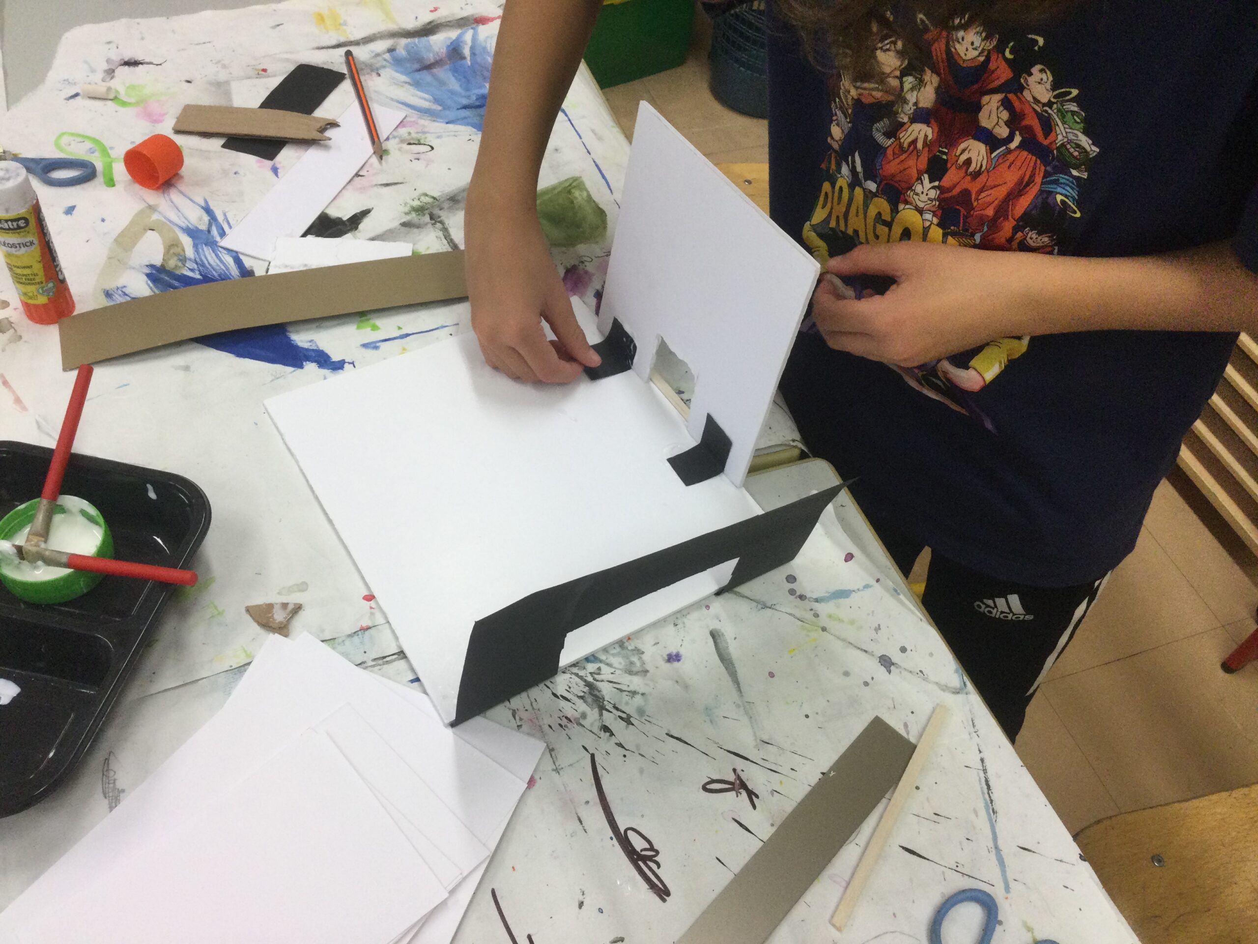 We provide a variety of accessible, neutral-toned materials to help children focus on shape and structure. These include foam board, cardboard, tracing paper, reflective and metallic paper, and mid-weight paper between 120 and 160 grams. Tools include scissors, glue, tape, cutting mats and cutters, which are used with supervision. We also offer balsa wood rods to support model stability.
