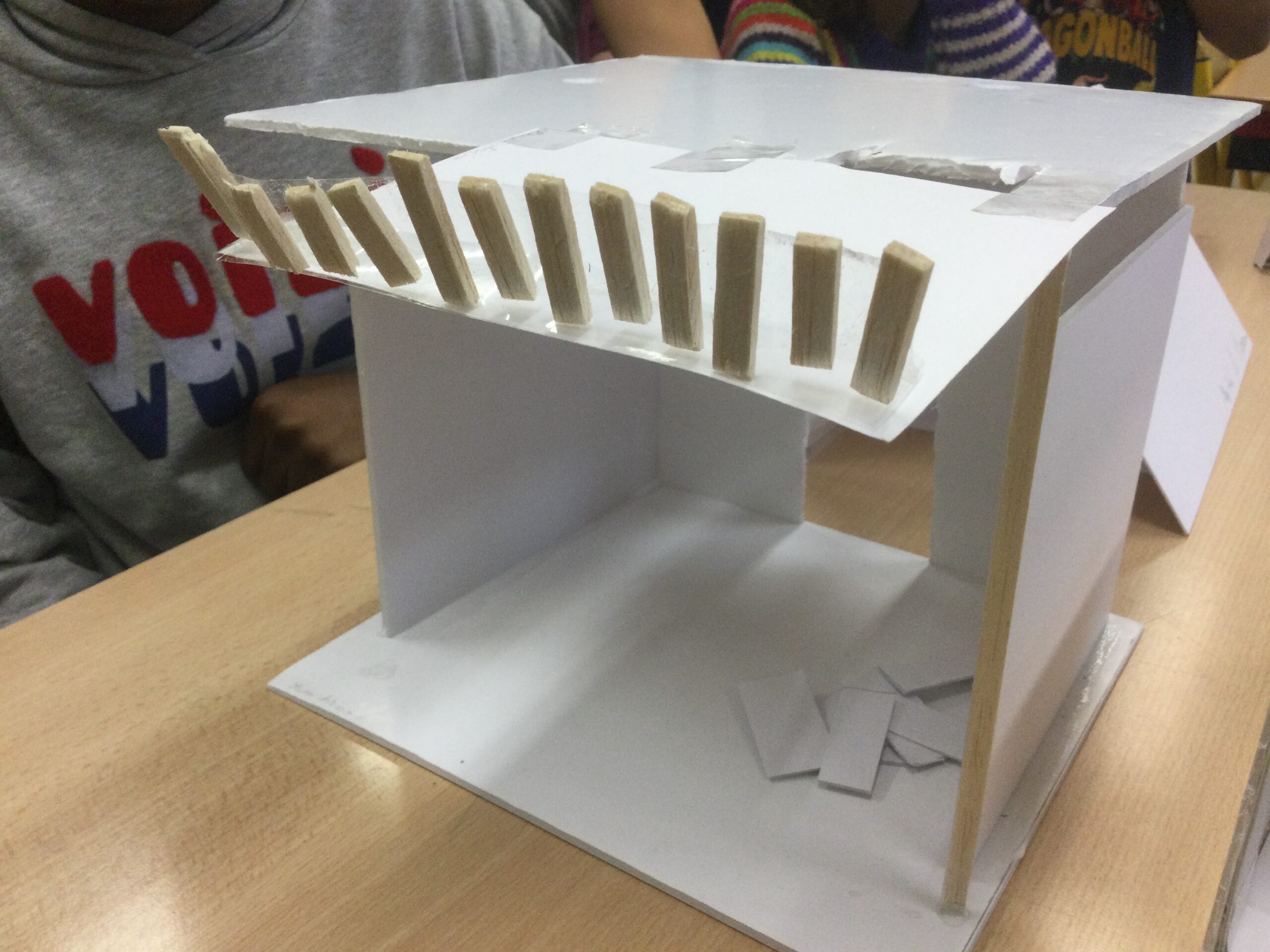 We present the full range of available materials and explain their properties. The facilitator demonstrates basic model-building techniques including folding, gluing, cutting, stacking, layering and creating openings or compartments. We show examples of both stable and unstable structures. Each group must find ways to keep their models standing using only the provided materials.