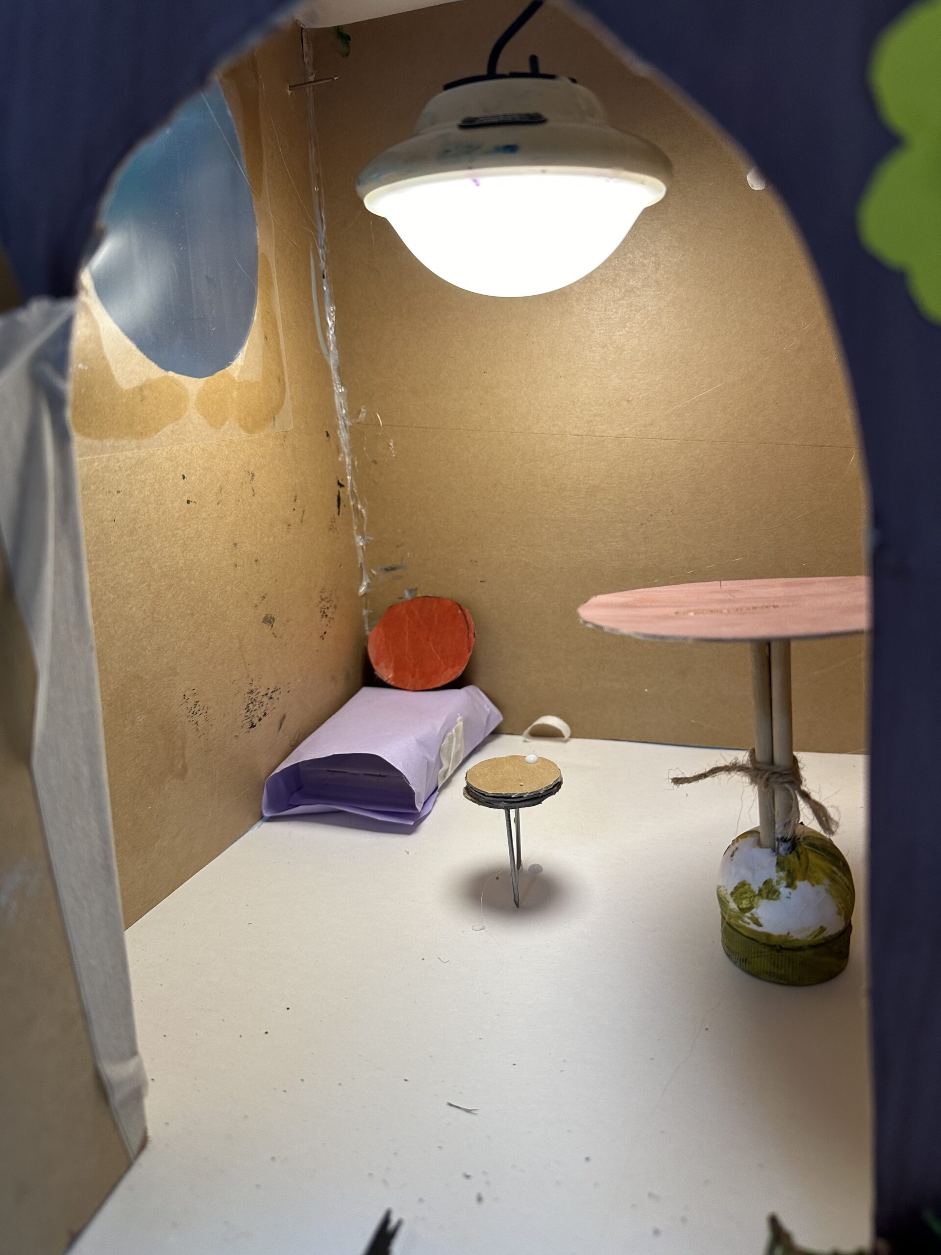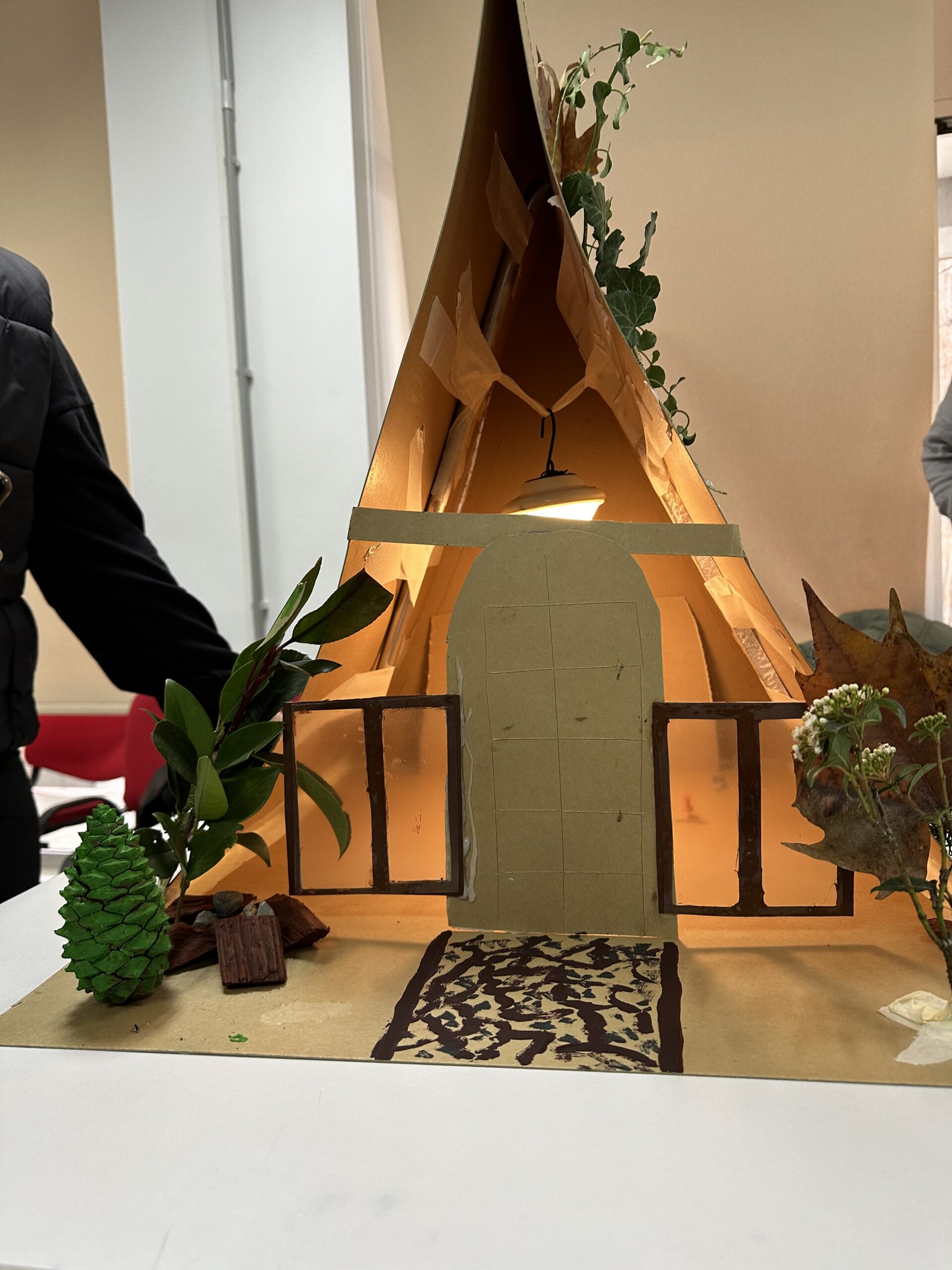The challenge was to build a house for an imaginary, minority community member using natural an materials and provided cardboard and crafts supplies. They were asked to think well about special needs, atmosphere, emotions of the community member. The students had made kinetic devices the day before, and were able to place them inside their houses.