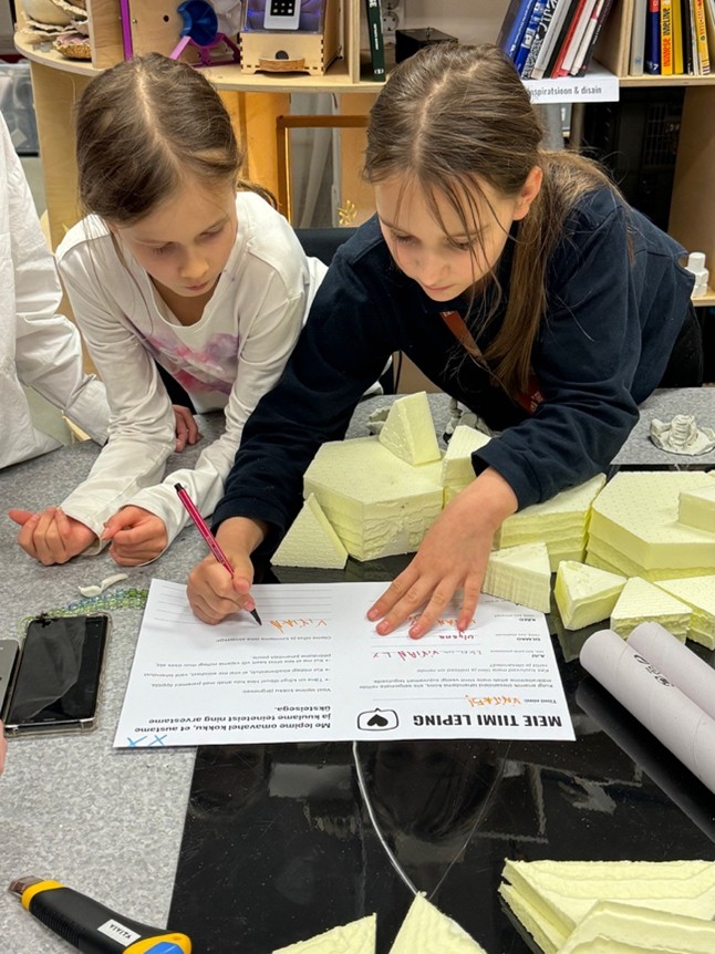 The space was organised to support creative, hands-on group work and flexible movement. Two main tables were set up for the group prototyping tasks, and an additional table was designated for “messy” work like cutting and painting. Materials and tools were sorted in labeled boxes with playful acronyms (e.g. BOAT – Box of All Things) to help kids find and return items easily. A screen displayed workshop instructions and inspiration videos. The open, well-lit space allowed for free movement and informal breaks. Modular furniture on wheels enabled quick reconfiguration, but separate team tables sometimes created unnecessary competition. Noise-cancelling headphones and background music helped with focus, though the space lacked a quiet area for overstimulated participants.
