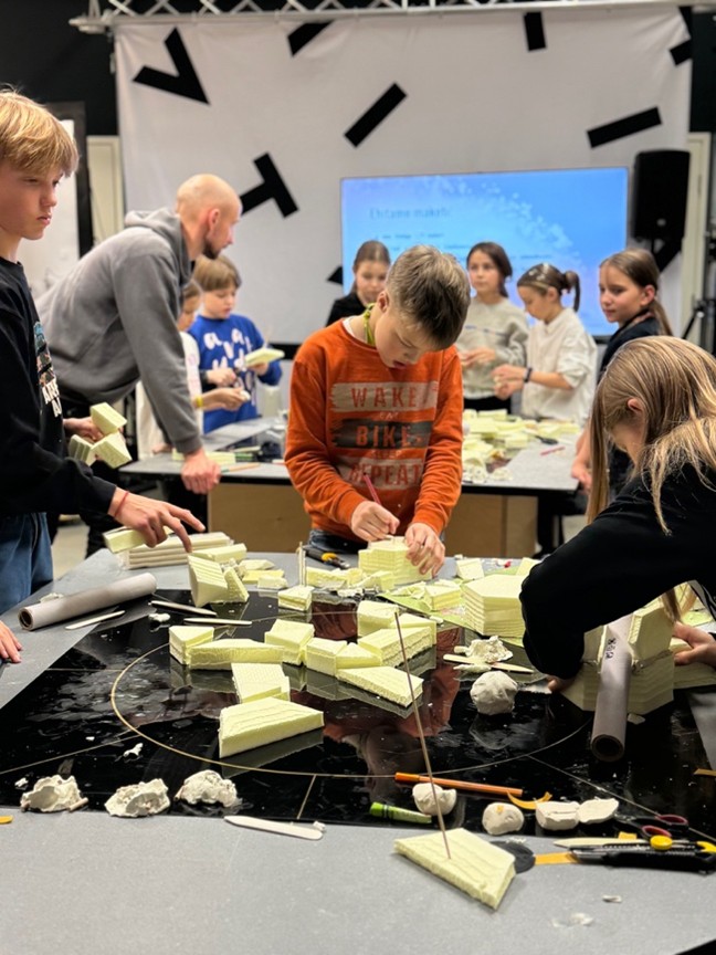 We worked with a group of youth aged 9–13 who are members of the VIVITA creativity accelerator (Vivinauts). These young makers regularly visit the open-plan makerspace after school to experiment, build, and socialise. They joined this workshop to take part in a guided design activity with real-world impact. Some came with a strong interest in creating things; others were curious or looking for inspiration. The group was mixed in gender and motivation but shared a common interest in hands-on exploration. The workshop also engaged the City of Tallinn, which commissioned the youth to design a Snow City as a participatory public space initiative.