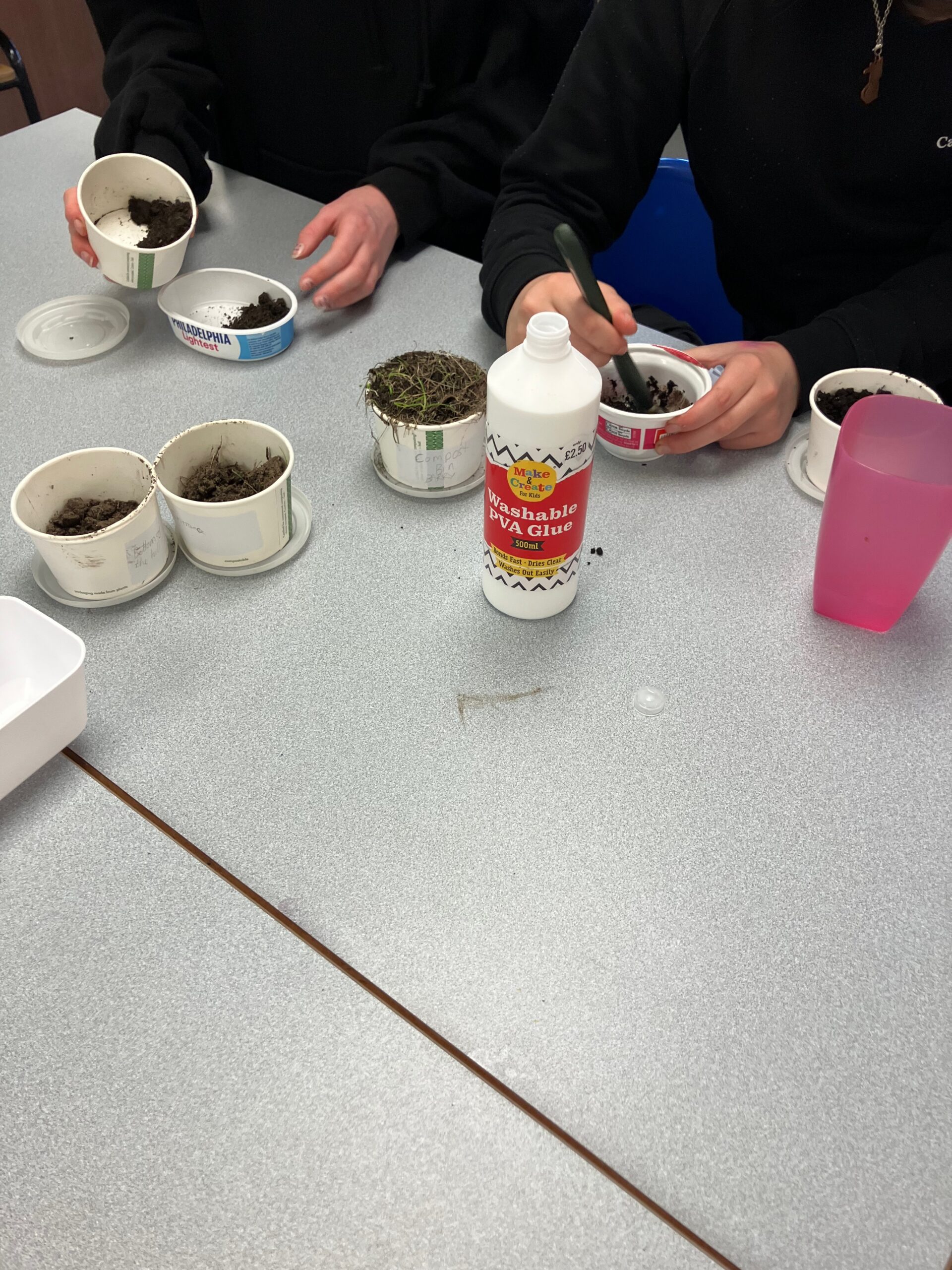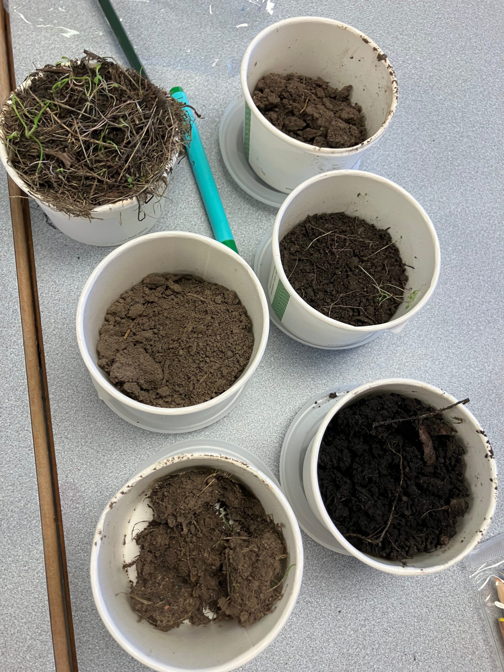 We add a soil separation observation by placing different types of soil in water and watching how the particles settle. This allows students to see layers of particulate matter, clay and organic material. We also use lenses and a microscope to study the samples more closely.