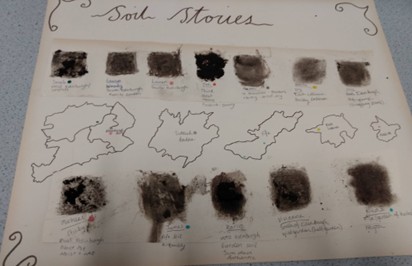 Each student brings a soil sample from their own backyard. They come from different parts of Scotland, adding variety to the materials. Other resources include aged paper, old brushes, a microscope (optional), printed soil charts, water, PVA glue, a selection of soil poems from From Field to Palette: Dialogues on Soil and Art in the Anthropocene by A. Toland and J. Stratton Noller (2018), and a short video titled I Am Soil, available online at https://youtu.be/Dor4XvjA8Wo.