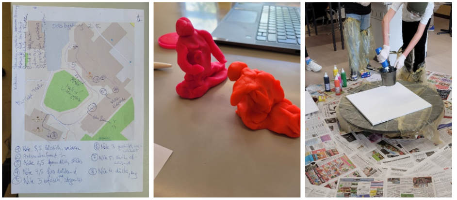 In Germany, PHW worked with different groups of students, at University and secondary education level, to introduce them to a form of experiential learning to connect the abstract knowledge of science courses with greater engagement with their own experience of sensing colour and materials and making sense of their own environment. Mapping and drawing were facilitating approaches in this case to draw students out and lead them out to practice with approaches that were more open-ended and allowed for creative and affective responses to places and materials, exchange of perspective and empathy while working with other people and considering other creatures in the environment outdoors.