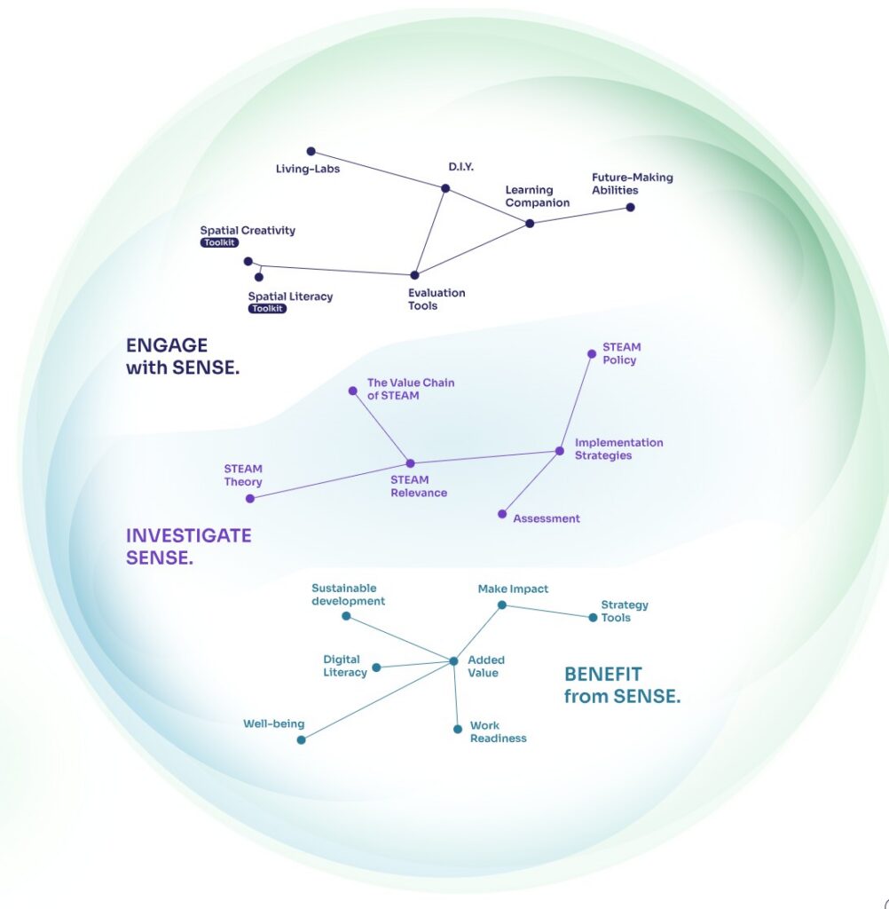 The initial step in adopting the SENSE.STEAM approach involves raising awareness. At the micro-sphere level, teachers and classes can quickly familiarize themselves with the SENSE. approach by participating in STEAM Labs and their associated events and training. These labs aim to enhance the knowledge and skills of teachers and students in two areas: 1) integrating artistic practices based on human senses into science education, and 2) enabling students to develop their skills through process-based learning pedagogies. This should lead to the establishment of ‘integrated STEAM subjects’ in schools, revising science courses accordingly. Teachers can customize these subjects by combining disciplines like physics and art, considering available teaching space. New STEAM topics will evolve through methodologies such as design-based research (DBR).