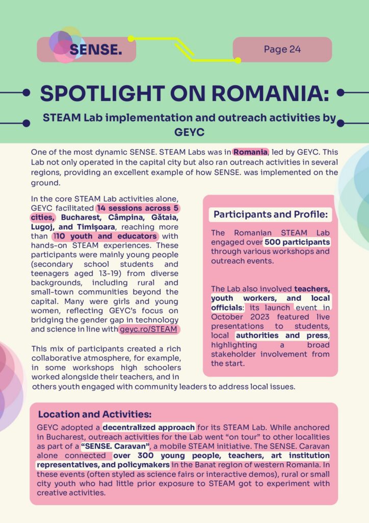 This impact report is for the public and for current and future stakeholders of STEAM education: educators, curriculum designers, decision and policy makers, and anyone interested in teaching and learning. It features the impact at the consortium level and then dives into the Romanian case study of GEYC’s activities, focusing on the Labs and outreach efforts.